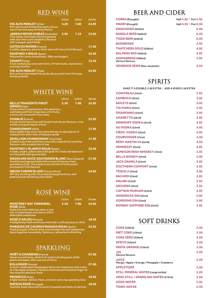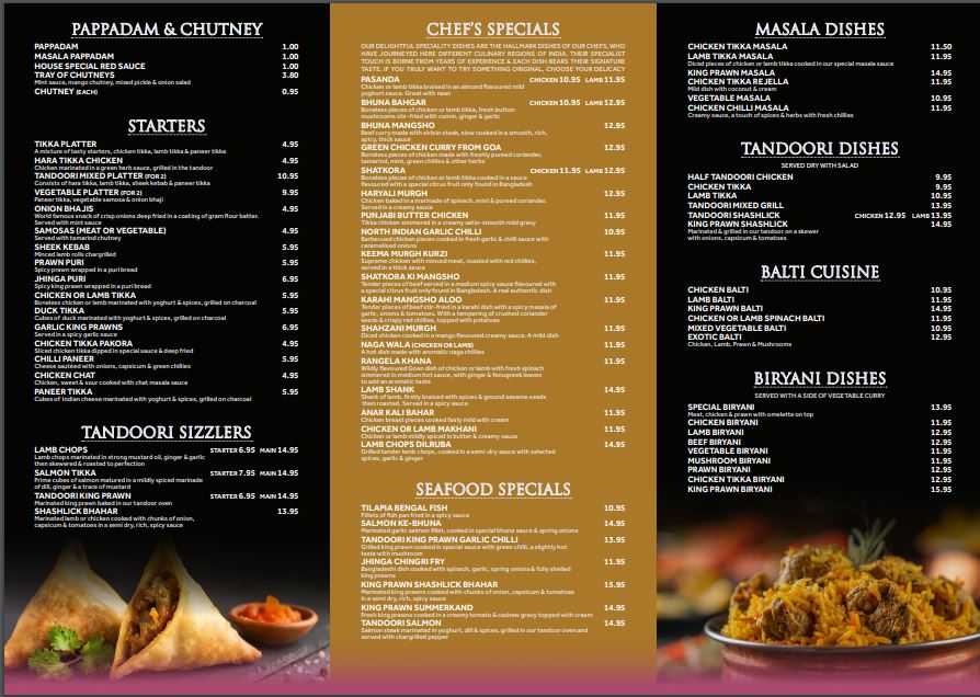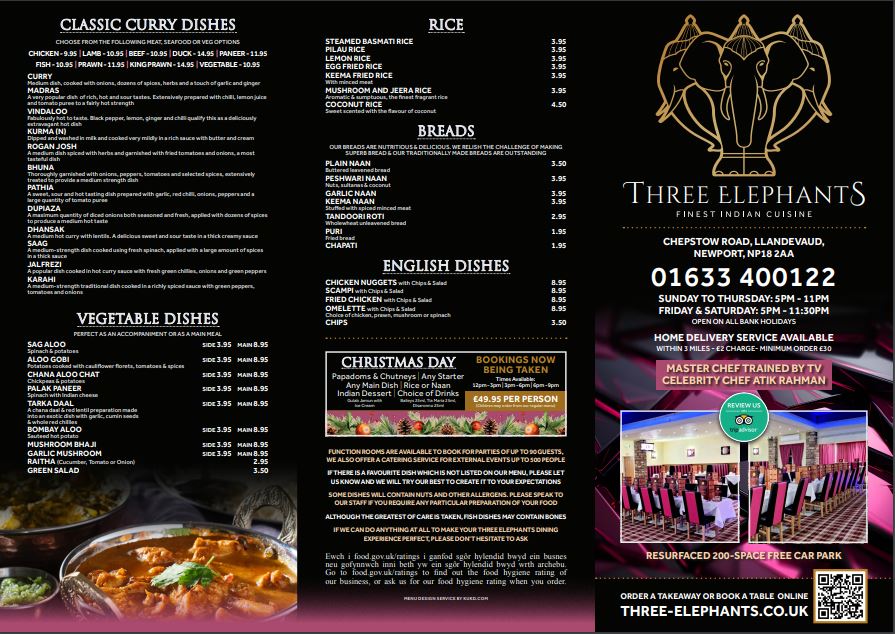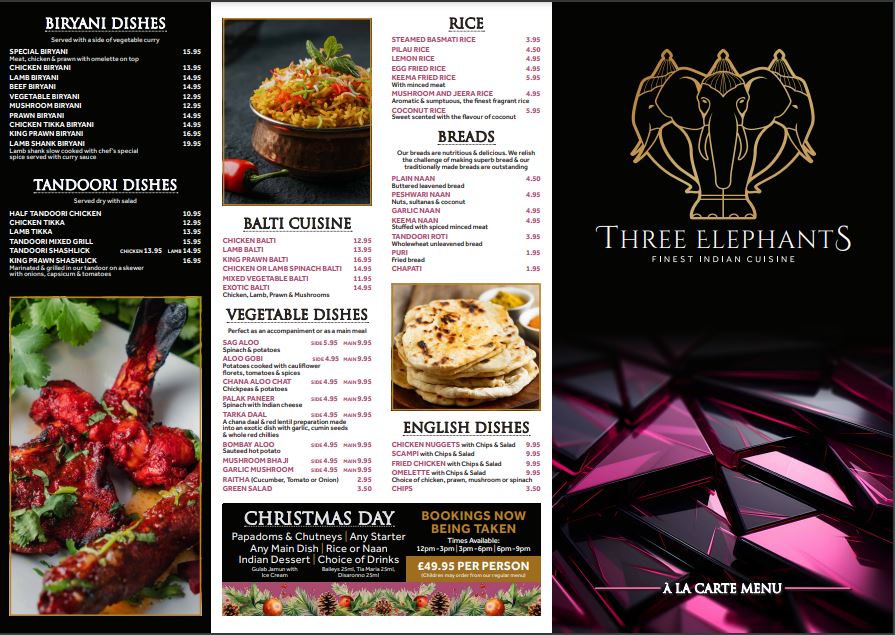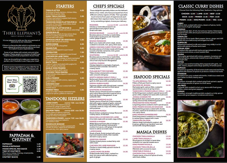 The menu at Three Elephants Llandevaud offers a rich and diverse selection of dishes, making it a great choice for anyone seeking a flavorful dining experience. Start your meal with appetizers such as the Tikka Platter or Hara Tikka Chicken, or opt for a Tandoori Mixed Platter. For the main course, there’s a tempting variety of Chef's Specials like the Pasanda or Bhuna Mangsho, and for those craving a more traditional curry, classics like Madras and Rogan Josh are available. The Masala Dishes, including Chicken Tikka Masala and Lamb Tikka Masala, are sure to satisfy fans of rich, creamy curries. Seafood lovers can indulge in specialties such as the Tilapia Bengal Fish or Salmon Ke-Bhuna, while those seeking a smoky, grilled flavor can enjoy Lamb Chops or Salmon Tikka from the Tandoori Sizzlers. The Biryani Dishes offer a fragrant rice option, with choices like Chicken Biryani and Vegetable Biryani. Complement your meal with a side of Steamed Basmati Rice or Garlic Naan, and finish off with a refreshing drink, perhaps a Cobra beer or a glass of Chablis. Whether you're in the mood for a hearty curry, a sizzling platter, or a flavorful seafood dish, the menu at Three Elephants offers something for every taste.